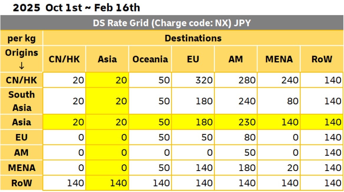Demand Surcharge(繁忙期追加金)を2025年10月1日から2026年2月16日まで導入するとの通達が入りました。